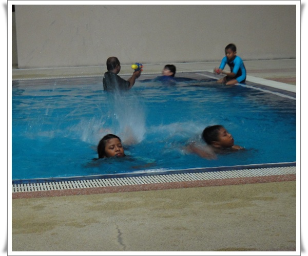 Lepas Maghrib terus masuk ke pool.......... mula-mula dia orang berenang kat kolam kanak-kanak, bila dah ramai budak yang mandi manda dia orang pindah pula ke kolam yang besar..... tapi aku tak bagi dia orang berenang sehingga yang kat kedalaman yang 2 meter tu..... aku suruh dia orang berenang dari tempat 1.2m ke 1.5m sahaja..... cukup sampai kat 1.5m, aku suruh dia orang pusing balik........